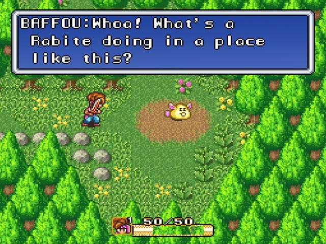 Frankly, travelling with your companions in Secret of Mana is a bit like travelling with a dim-witted friend who somehow keeps slamming the seat of their pants in every door you pass through. Unsticking them time and time again is irritating, but hey, they're your friend and you love them. The SNES version of the game lets two flesh-and-blood players take up the reins in place of the game's feeble AI, but that requires a Multitap accessory, and I doubt the SNES Classic Edition supports chunks of third-party hardware. At least the console comes with a second controller, so there can be two of you to cut away obstructive bushes and grass from the third idiot.
