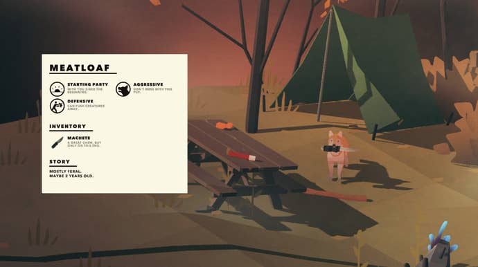 Structurally, you could say Overland is something of a roguelite. It's not just the levels that change every time you enter a new game (or continue one), it's also the characters you play as and meet. At the start of each new game, you drive into a relatively unthreatening area (most of the time), rescue a person or a dog, and recruit them to your party. Every human or dog has a random name and a unique character trait, like a mechanic who can repair cars without expelling energy, or a dog who likes to bark a lot. Some traits I found were more useful than others—shouts out to my boy Reid with the bonus energy bar—while others had traits that left me groaning a little. Once I even ended up with two party members who were both bad at driving, meaning they both used more fuel whenever they were in the car. It led to expected disaster.
