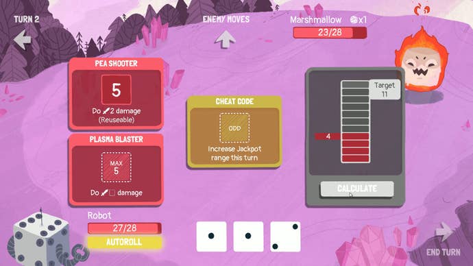 Each character has their own unique skills and way of using the dice. The Warrior is straight, using the dice to defend and attack. The Thief can manipulate its dice, breaking them apart or bumping their strength up by one, in addition to stealing one of their current enemy's skills. While everyone else rolls a certain number of dice depending on their current level, The Robot has a CPU meter that summons as many dice as possible, as long as you stay underneath a total maximum. The Jester doesn't have set skills at all, instead drawing skill cards at random; even more chaos on top of the dice rolls.