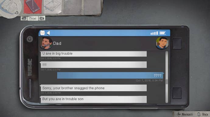But before that, we get a taste of the two brothers' home life before things get turned upside down. Sean's skateboard kid-like edge immediately feels familiar to me (unlike Chloe's Hot Topic-imbued "punk" from the first series), and his home life does too. His dad is a good dude who cracks a lot of jokes and values honesty above all else—when I was Sean's age, I was honest with my step-dad about drinking and whatnot like Sean is, and he'd just impart the "be safe" wisdom and tell me to call him if I needed a ride. Sean's dad is the same way. It's pretty much the opposite living situation of the not evidently-related yet The Awesome Adventures of Captain Spirit prequel from earlier this summer.