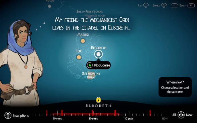 It soon turns daunting though, whether it's your first or third playthrough. With each new fact learned—whether from an artifact you discover, an etching of the Ancient language (merely called "Ancient") you find, or a conversation with an NPC—the vast timeline of the world grows, dating back anywhere from mere minutes to thousands of years ago. It's intimidating to sift through, and makes Aliya feel astoundingly small in the grand scope of this fascinating world we're traveling through with her.