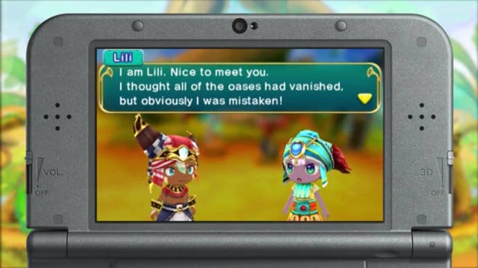 Party members likewise bring unique skills with them into battle. They are strong or weak against various monsters, and some have special abilities that can be activated to temporarily incapacitate a foe. The protagonist, who is always with the party, has a special whirlwind ability, which can be used to knock down flyers or lower the defense of sand-based enemies. All of these elements help to keep you on your toes, which in turn keeps Ever Oasis from becoming too repetitive—a common action RPG failing.
