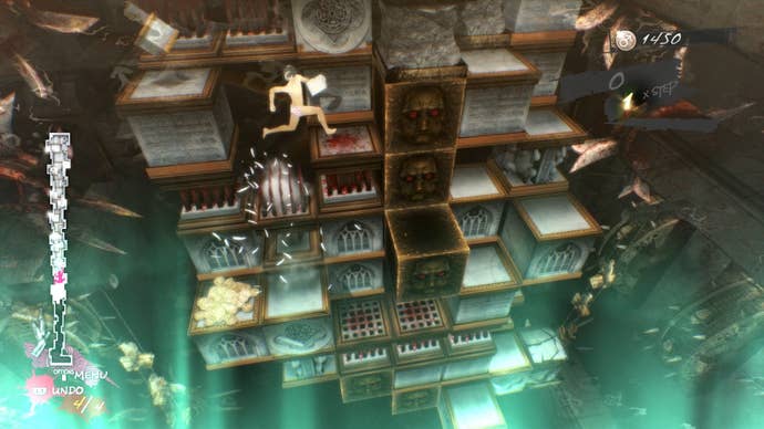 And that brings me to what you're doing when you're not watching cutscenes or boozing at the Stray Sheep: climbing up intimidating towers. Full Body shakes it up even more with its new "Remix" mode for the puzzles that make up the bulk of gameplay. In the puzzles, which are set in Vincent's nightmares, he climbs horrifying towers of blocks, pushing and pulling individual cubes to make his way upward. In Remix, Tetris-like clusters of blocks enter the mix. The puzzles are still nail-bitingly difficult, only now they have certain edges to make them more friendly to players. For instance, now there's an Auto mode so if you die, it can play you automatically back up to the point where you got stuck. I played a little bit with it on and felt like I was cheating, so I turned it off.