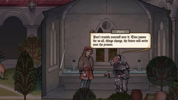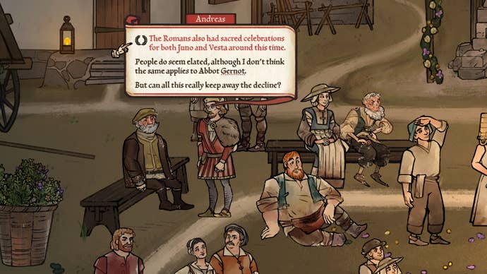 Don’t get me wrong: you certainly find clues, construct motives, and finger suspects (matron), but it’s left quite open as to whether or not you’ve condemned the right person. If you were actually expecting a Cadfael game, something akin to Frogwares’ Sherlock Holmes series, you might come away feeling unsatisfied. But this, again, comes across as quite deliberate. Pentiment goes to great pains to remind you that history is inherently unknowable. We can see from the footprint where the owner of the boot might have been headed, but we can’t know if they were wearing a hat. Or if they bludgeoned anyone to death when they got there.